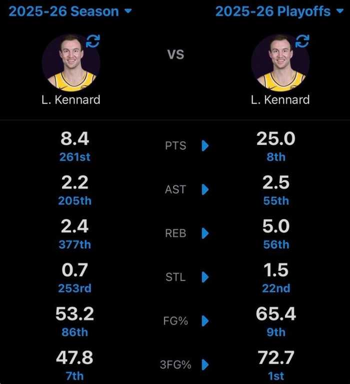 肯纳德本赛季常规赛场均8.4分2.3板2.2助 季后赛场均25分5板2.5助